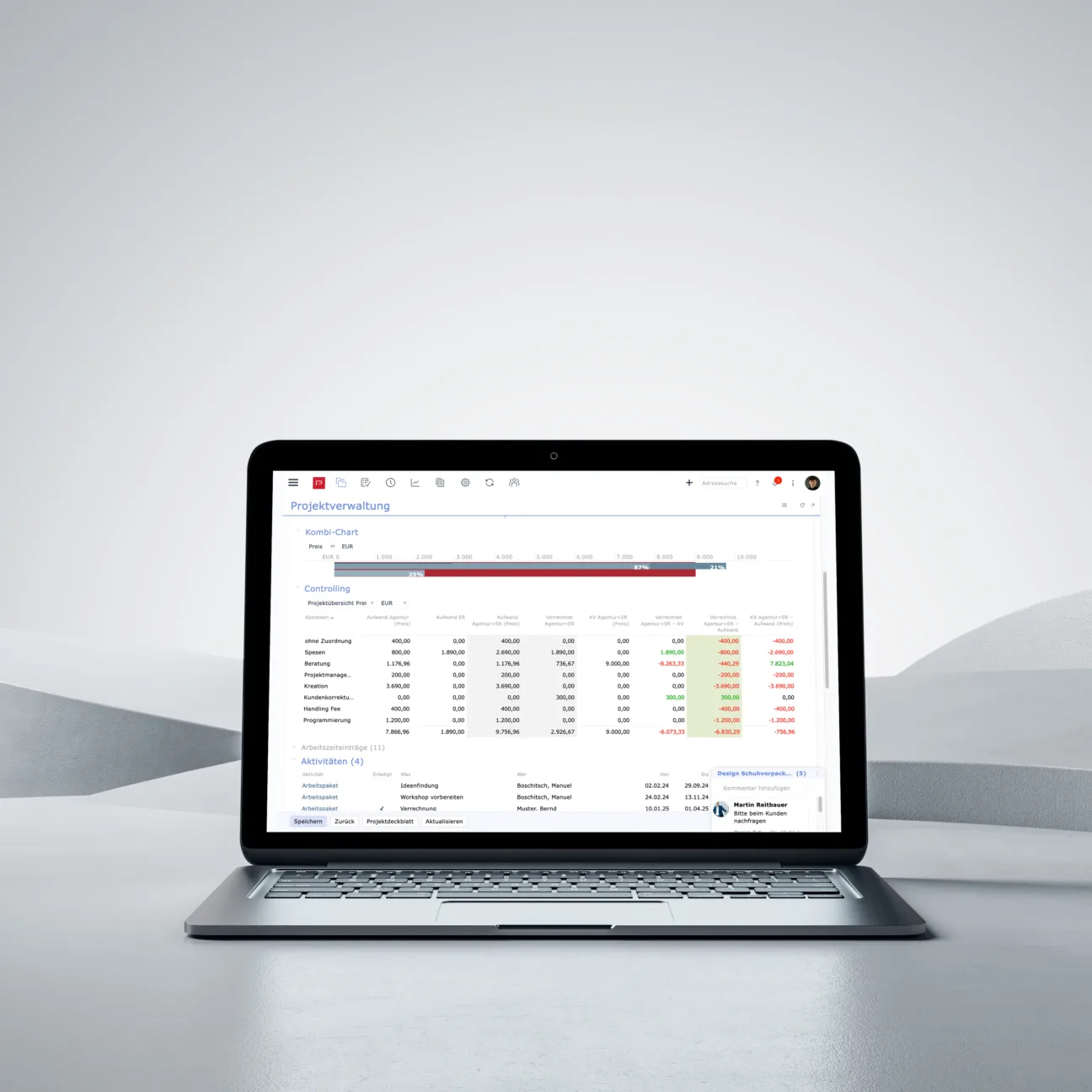 Sie verfolgen nicht nur die Projektkosten, mit detaillierten Prognosen sind Sie immer einen Schritt voraus. Automatisiertes Rechnungswesen und detailliertes Controlling gehören ebenso zum Funktionsumfang, wie individuelle Reportings.